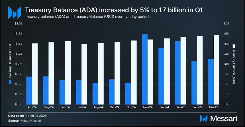 Cardano 的金库余额环比增长 5%,达到 17 亿 ADA,但由于 ADA 价格下跌,其美元价值下降 19%,至 11 亿美元。