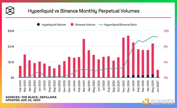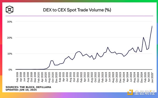 去中心化交易所(DEX)交易量与中心化交易所(CEX)交易量的比例达到了历史新高——27.26%。这波增长主要来自衍生品交易所 Hyperliquid,其市场份额迅速扩大,目前已达 10.38%,也创下其自身的历史新高。