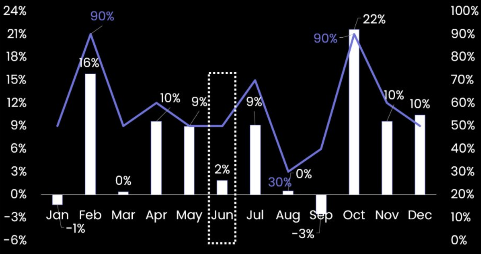自 2020 年以来,BTC 在 6 月份往往跌多涨少。历史数据显示,六月平均收益率仅为 1.9% ,上涨概率为 50% 。