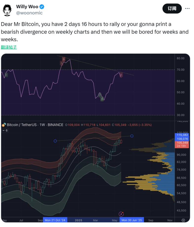 5 月 30 日,Willy Woo 发文称,比特币若在未来两天半内不出现反弹走势,将在周线图上形成看跌背离,随后市场可能将陷入长时间的低迷震荡期。他以调侃口吻称「我们将会感到无聊好几个星期」。