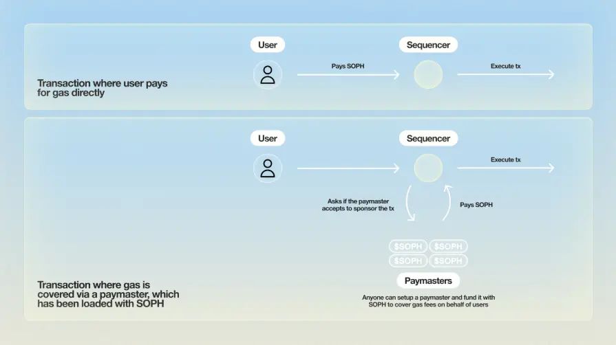 不过,得益于 ZKsync 的原生 Paymaster 技术,用户并非必须持有 SOPH 才能完成交易。Paymaster 是一种智能合约,旨在为其他账户补贴或定制交易费用,从而提供更流畅的用户体验和更高的灵活性。这意味着:无需因 Gas 代币不足而频繁跨链;在某些场景下,用户甚至可以无需支付 Gas费。更多详情,请查看Paymaster。