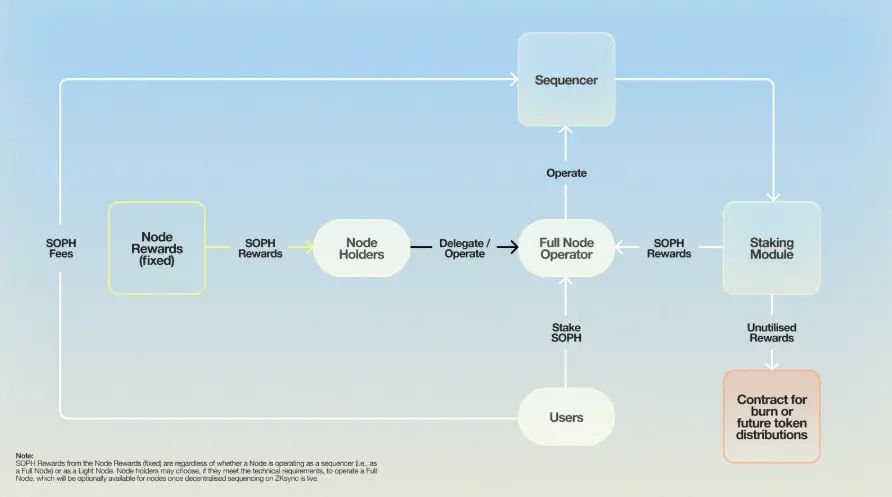 在Sophon网络中,质押不仅用于保障网络安全,还能为参与者带来奖励收益。随着ZKsync网络即将开启排序器的去中心化,Sophon的全节点(Full Nodes)将有资格运行排序器。全节点运营商需质押10万枚SOPH代币方可参与运营,届时可获得部分Gas费分成。