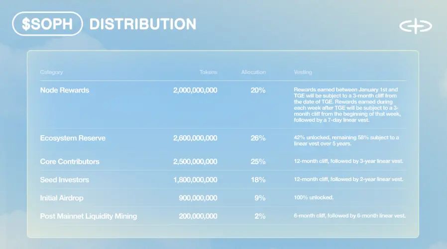 节点奖励(Sophon 守护者):20亿枚 SOPH(占总供应量的 20%)