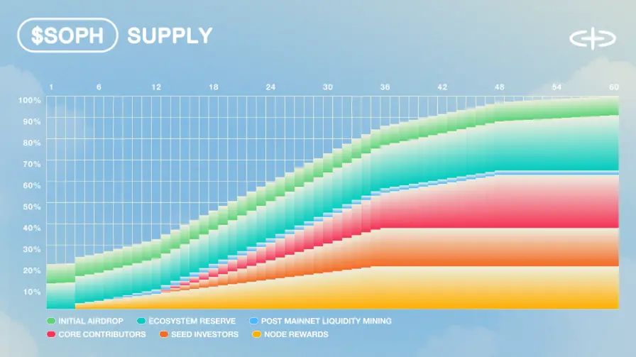 社区导向:超过三成的代币将回馈生态与社区(空投+节点+生态储备),提升用户粘性与网络去中心化程度。激励均衡:团队与投资人总共占比 43%,虽略高但仍在合理范围,通过合理释放安排,降低市场抛压风险。低启动膨胀:初始流通比例较低,有助于维护前期价格稳定,为生态建设赢得时间窗口。以下是SOPH代币的具体分配与释放计划: